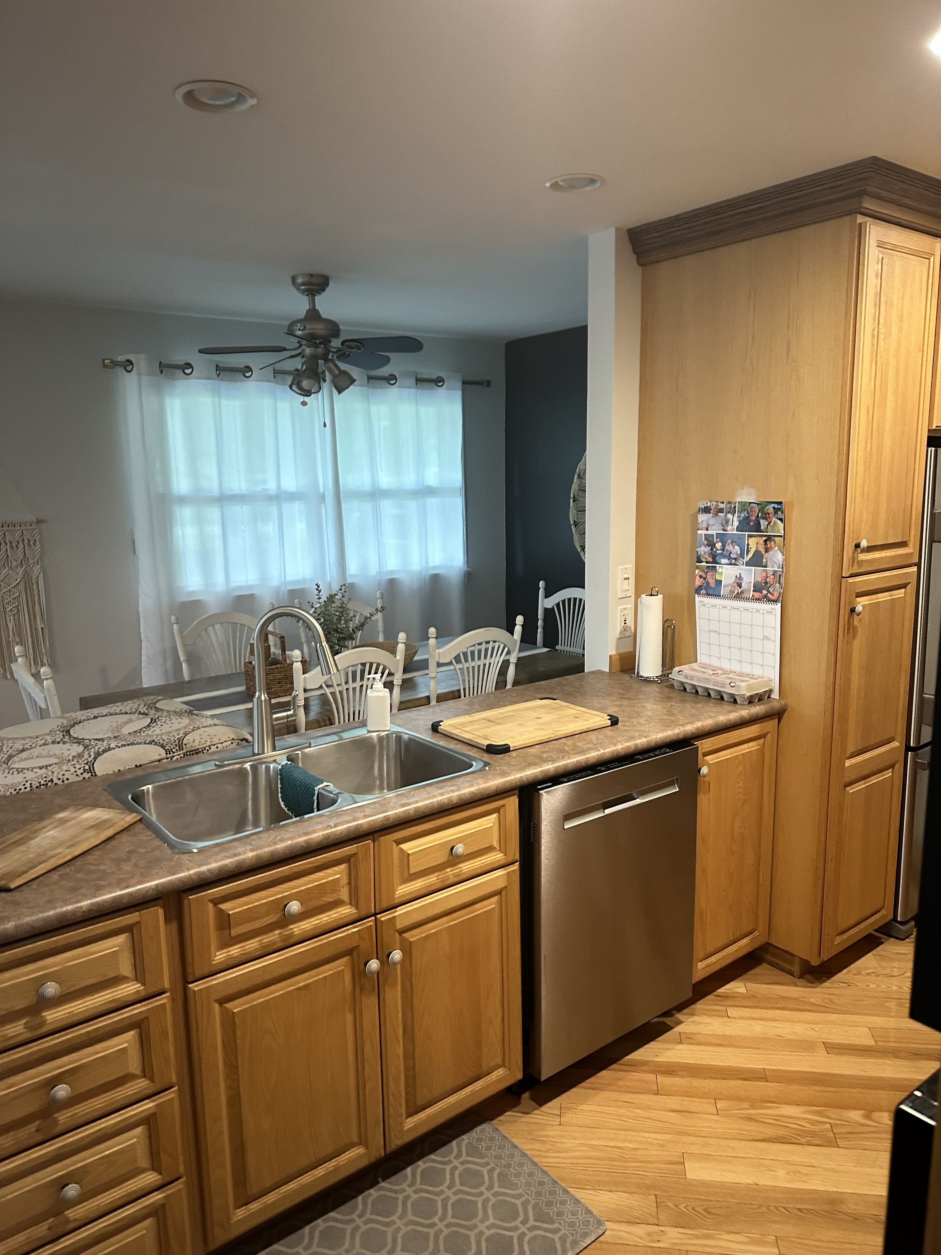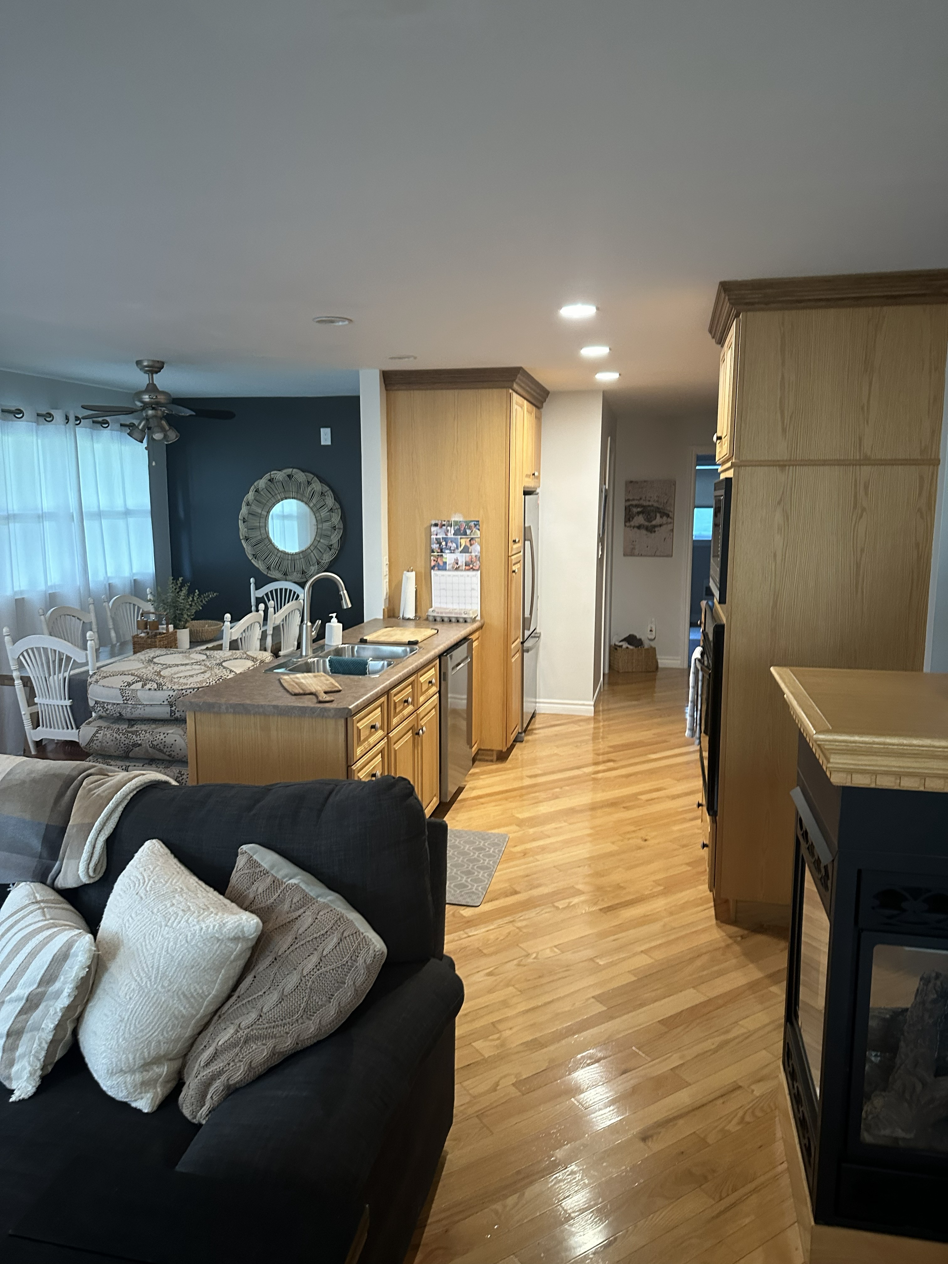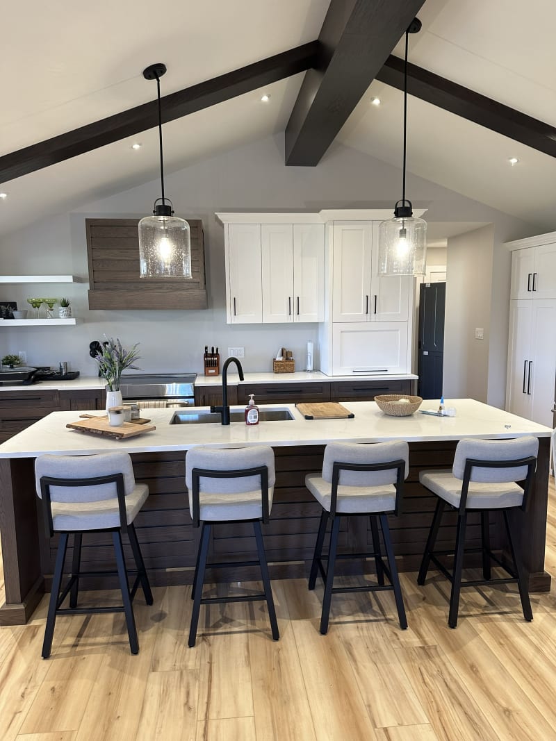 The renovation opened up the kitchen, dining, and living areas to improve flow and connection. A refreshed kitchen with a large island anchors the space, while new lighting, warm finishes, and custom built-ins create a cohesive, modern farmhouse feel. The finished space is airy, inviting, and built to be enjoyed year-round.